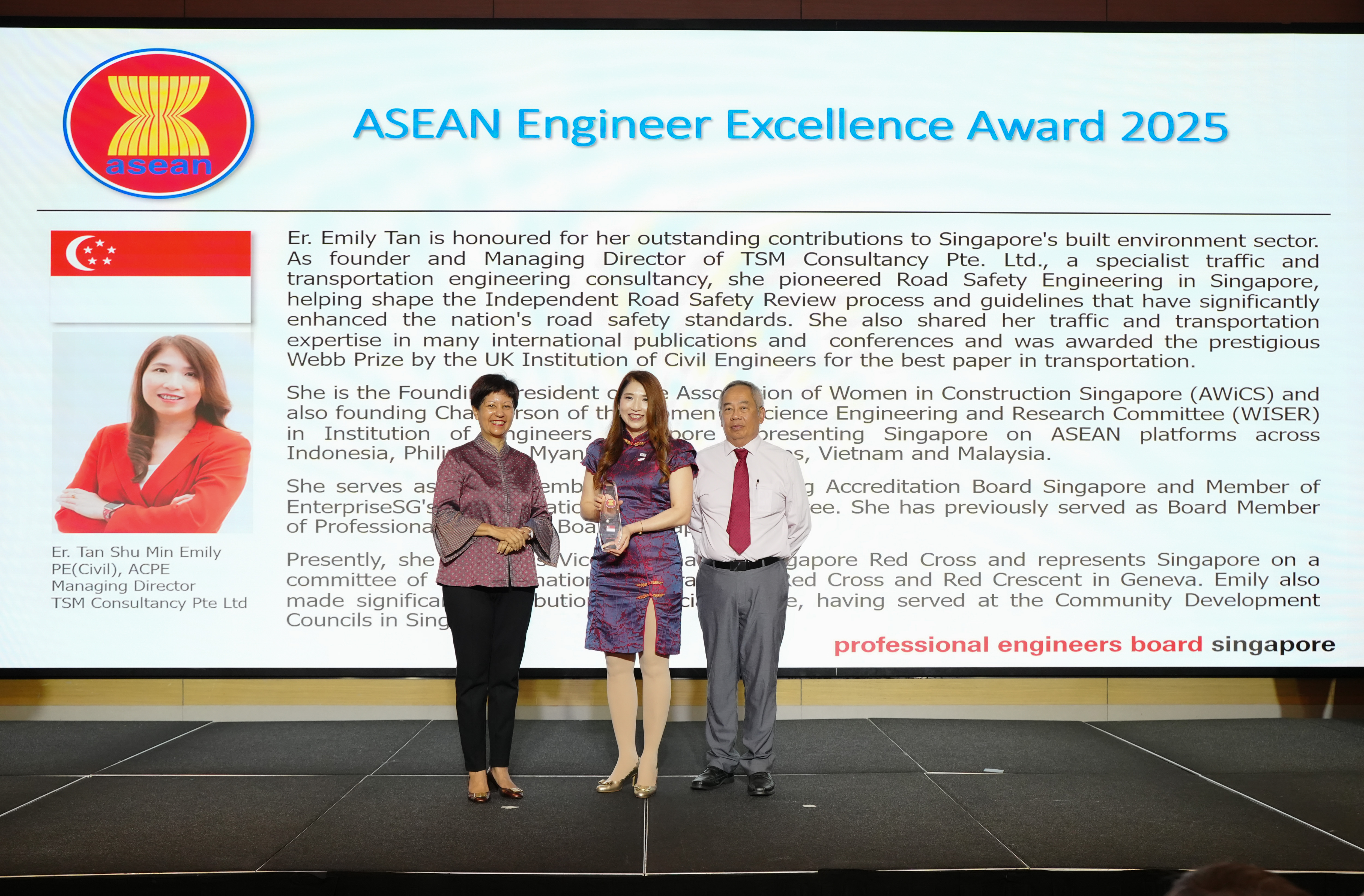 The ceremony also honoured Er. Emily Tan as the recipient of the inaugural ASEAN Engineer Excellence Award. A trailblazer in Traffic and Transport Engineering, she has served and contributed to both PEB and the Board of Architects, as well as local and regional engineering bodies. As the founding President of the Association of Women in Construction Singapore, she and her team have supported and inspired many young female engineers in the built environment sector.